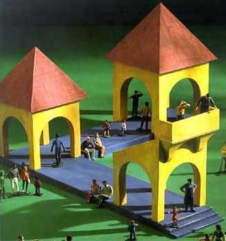 [Anterior][Siguiente]| Este camino es aparentemente plano, pero parece que lleva al primer piso, ¿cómo es posible?. Está claro que esta es una construcción que no puede darse en la realidad, nuestra vista nos vuelve a engañar. | | |  |